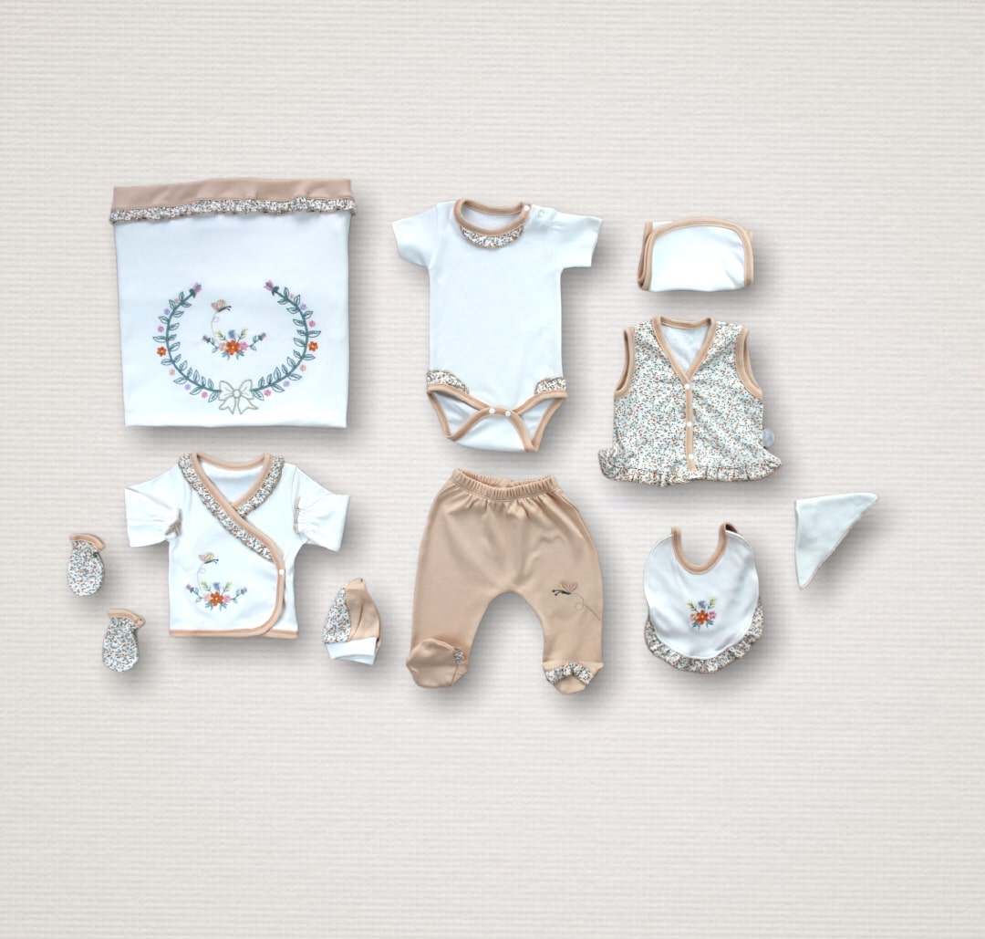 Bahar Çiçekleri Nakışlı %100 Cotton Antibakteriyel 10lu Zıbın Takımı Hastane Çıkışı -