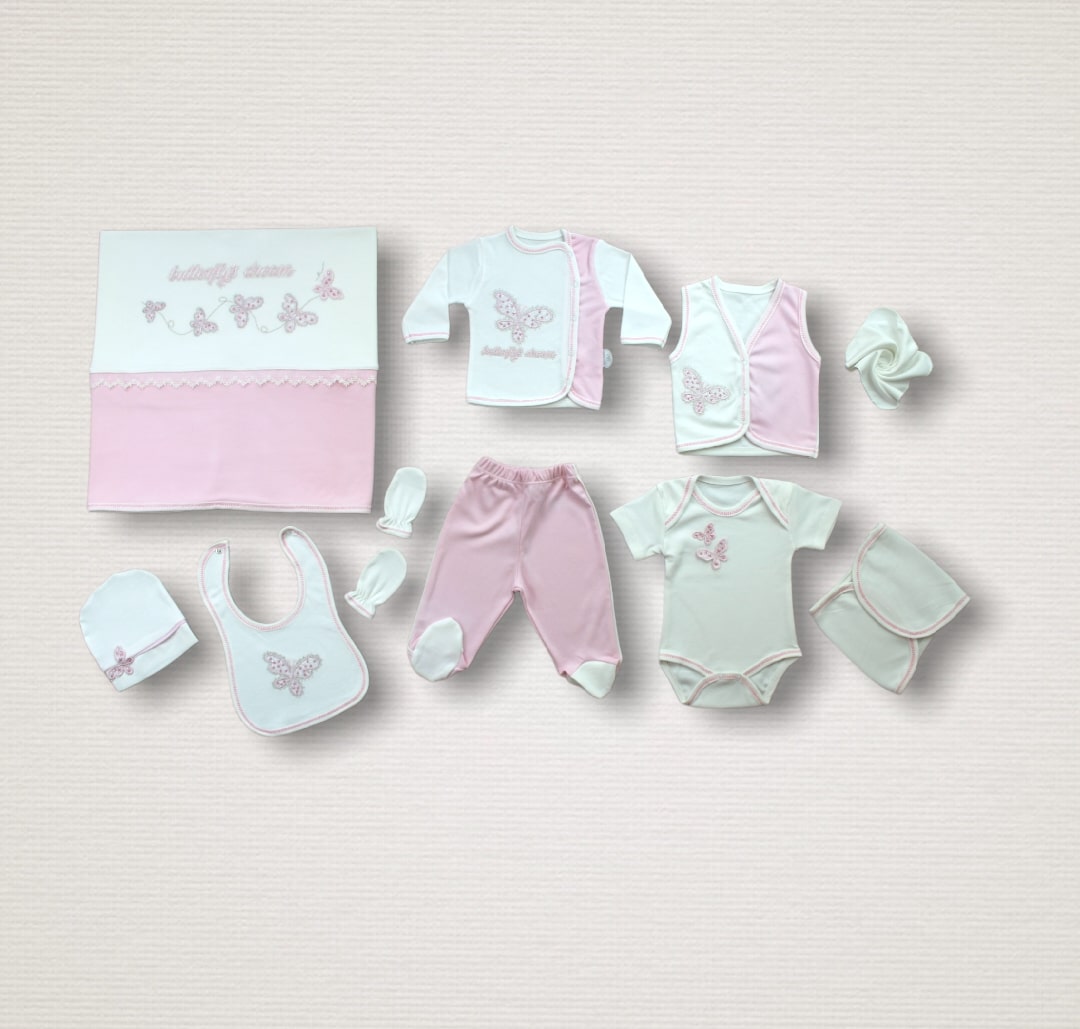 Uçan Kelebekler Nakışlı %100 Cotton Antibakteriyel 10lu Zıbın Takımı Hastane Çıkışı -