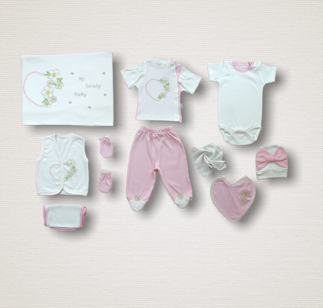 Baharın Çiçekli Kalbi Nakışlı %100 Cotton Antibakteriyel 10lu Zıbın Takımı Hastane Çıkışı -