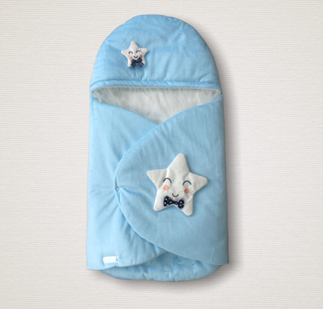 Yenidoğan Çift Yıldız Detaylı Şapkalı Duvaklı Erkek Bebek Klasik Kundak Bebek Battaniyesi -