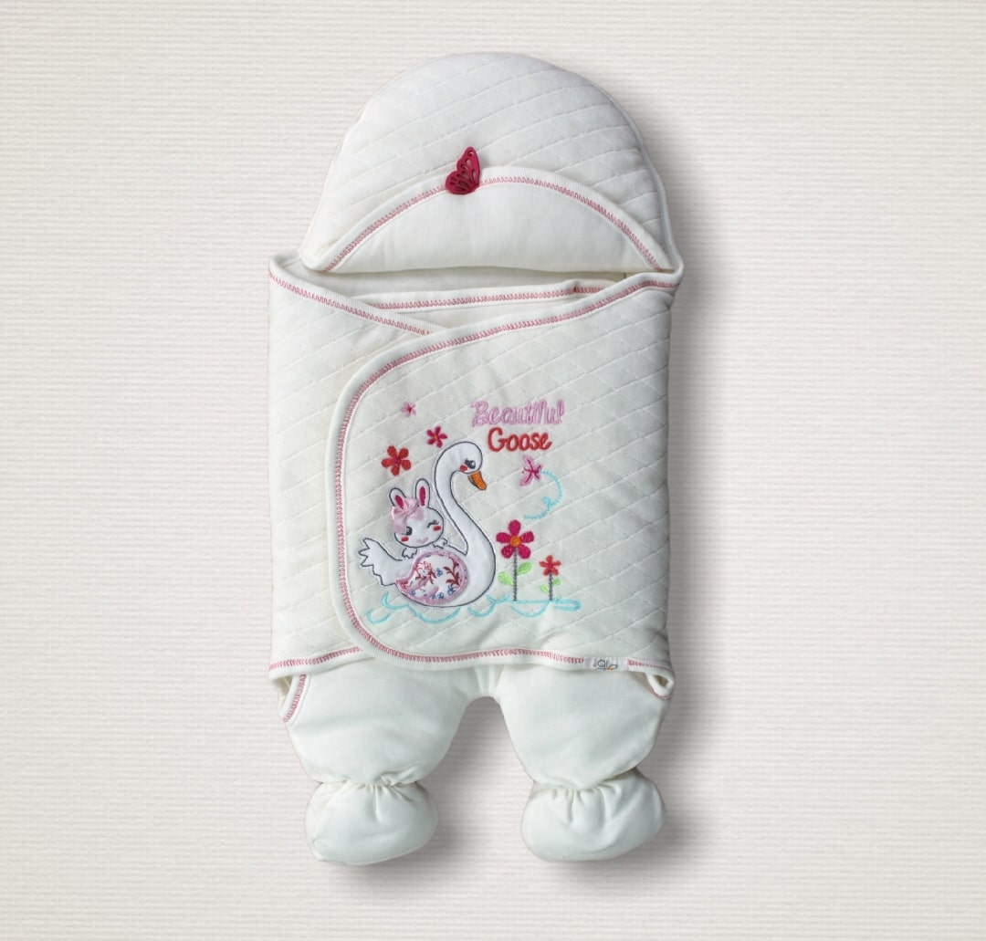 Yenidoğan Çiçekli Ördek Nakışlı Şapkalı Kız Bebek Ayaklı Kundak Bebek Battaniyesi -
