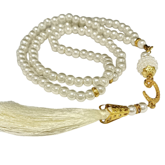 Namaz Tesbihi Vavlı 99'lu Cam İncili 35 Besmele-i Şerif Dua Kartı ile Krem Renk Hediyelik -