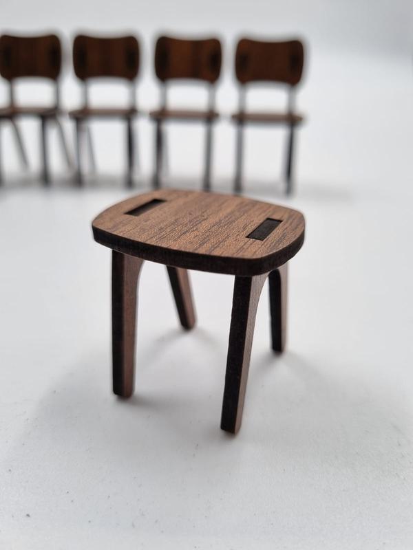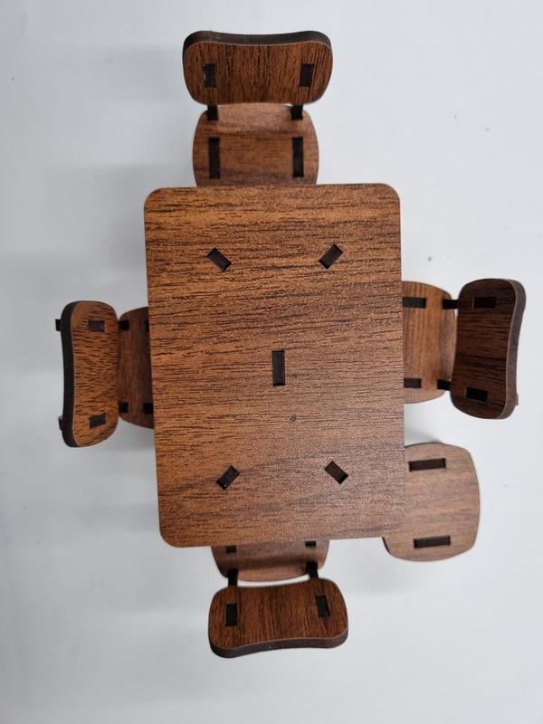 Ahşap Dekoratif Oyuncak Masa Sandalye Takımı 1 adet masa 4 adet sandalye 1 adet tabureden oluşmaktadır. Masa 9 cm x 6,5 cm, sandalye 6 cm x 4 cm, tabure 4 cm x 4 cm ebatlarındadır. Set kargo hasarlarını önlemek için demonte olarak gönderilmektedir. Yapıştırıcıya gerek duymadan kurum yapabilirsiniz. Lazer ile kesilmiştir, kurulumu kolaydır.; Dilerseniz dekoratif dilerseniz oyuncak amaçlı kullanılabilir. Oyuncak amaçlı kullanımda dayanıklığı artımak için geçme yerleri yapıştırılması tavsiye edilir. 3 mm çift çüzü ceviz kaplamalı mdf malzemden üretilmiştir.; Bakım gerektirmez (cila, boya vb.; ) Hafif nemli bir bez ile silebilirsiniz.